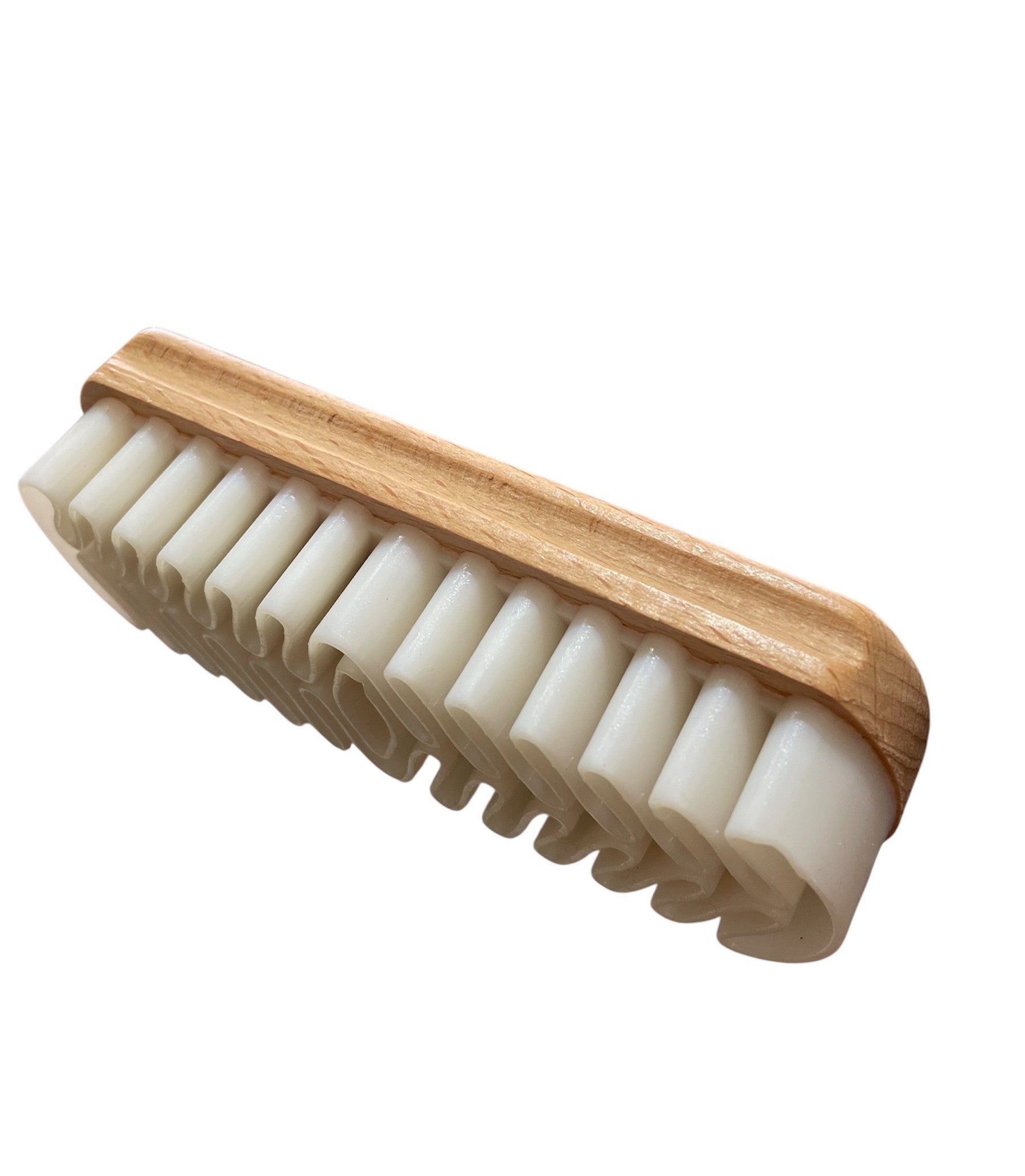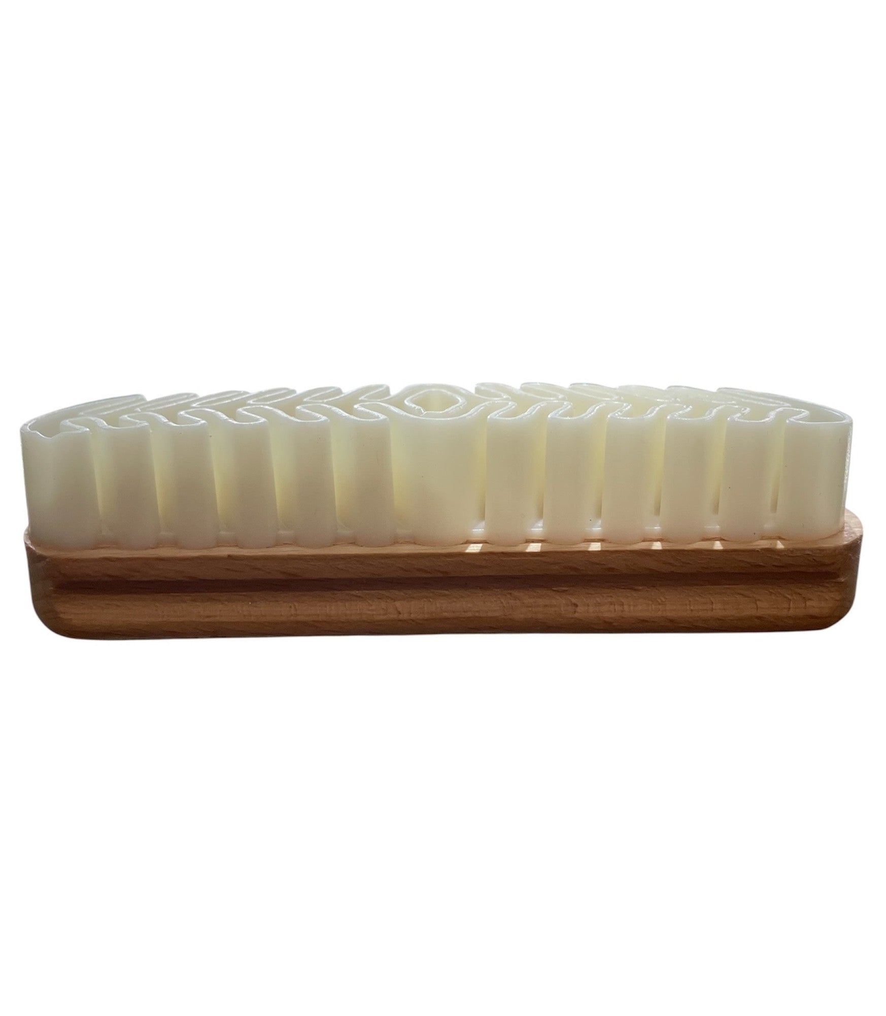 A gentle yet effective suede brush made with natural rubber and smooth waxed beechwood - ideal for removing dirt and refreshing the nap of your suede items.