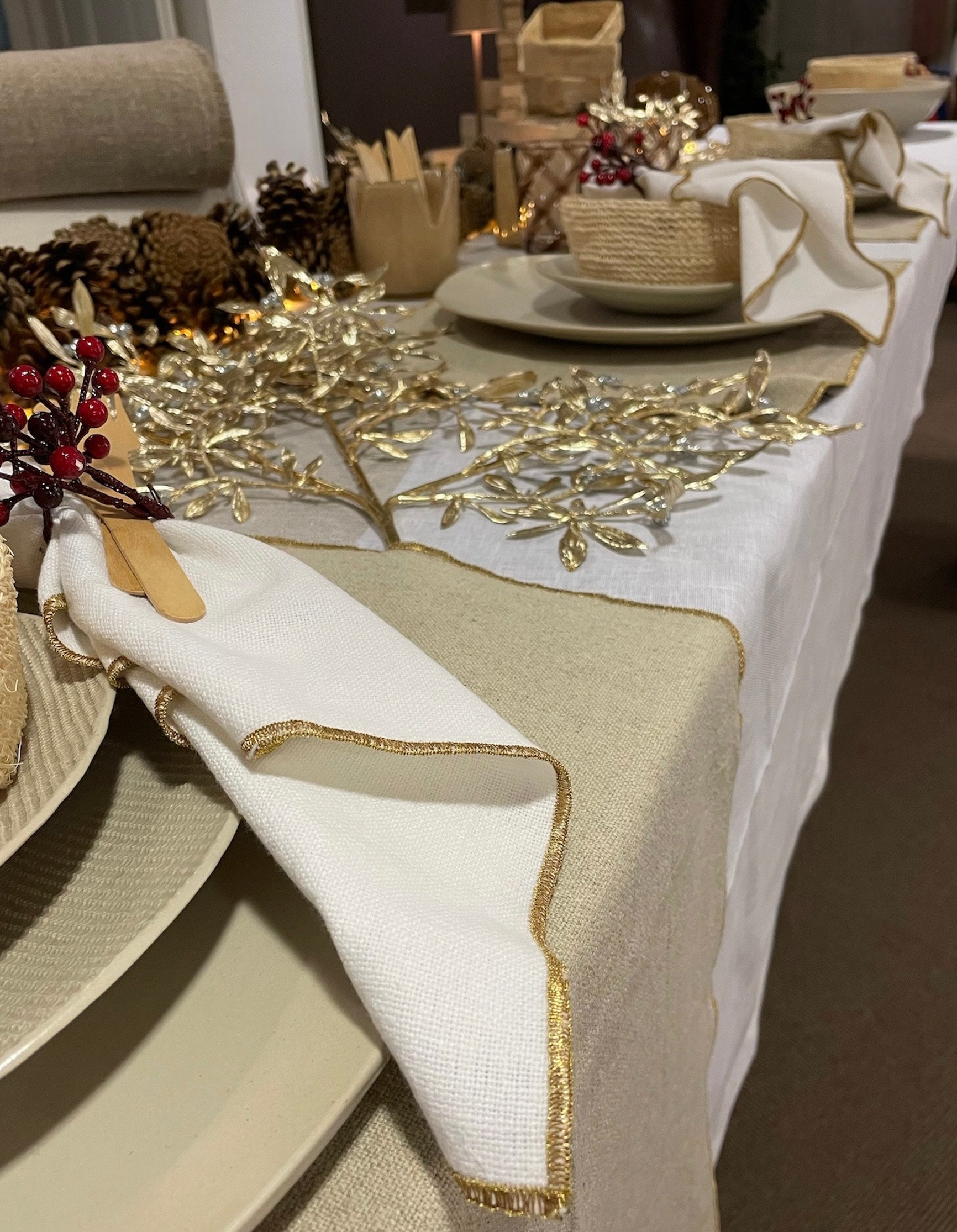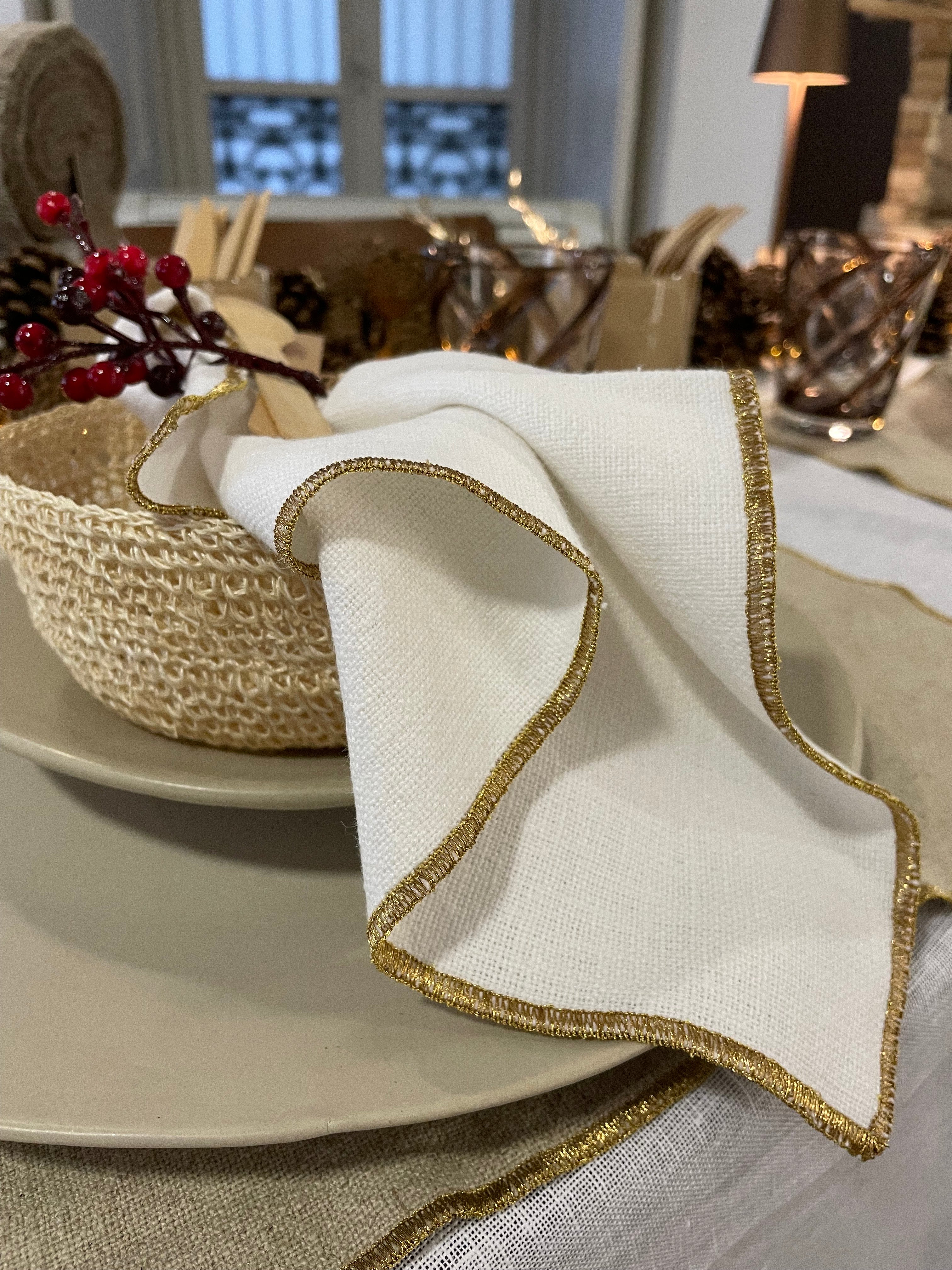 Made from a premium linen and cotton blend, this napkin’s golden border detailing enhances its simple, sophisticated design.